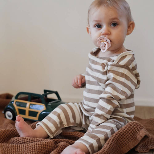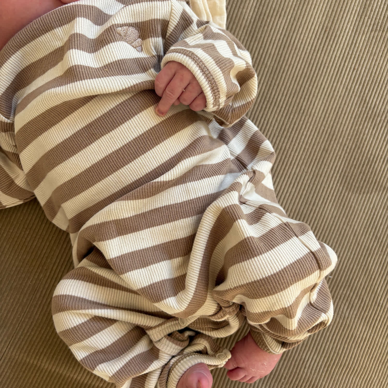 Der CARLET Anzug mit langen Ärmeln und dem charakteristischen, gestickten Croissant ist Teil unserer Basic-Serie. Er ist weich und bequem, perfekt für Spiel und Entspannung.