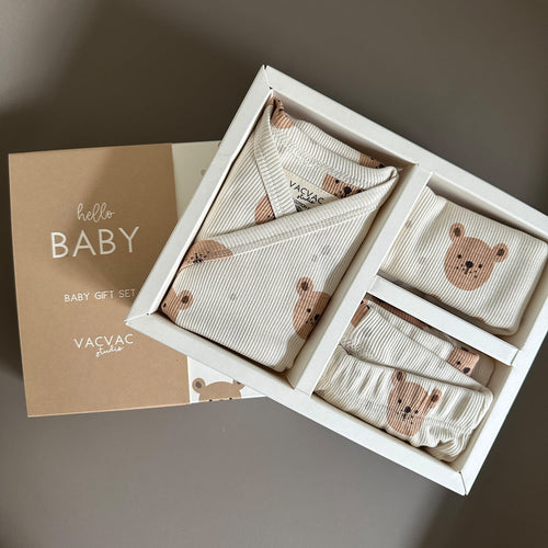 Dieses exklusive New Born Baby-Set ist das perfekte Geschenk für Neugeborene! Das Set wird in einer schönen, FSC-zertifizierten Pappschachtel mit einem hübschen Croissant-Print geliefert, und die Schachtel enthält drei praktische Fächer. Das erste Fach enthält einen Cross-Over Body, der das Ankleiden einfach und sanft macht, ohne den Stoff über den zarten Kopf des Babys ziehen zu müssen. Das zweite Fach enthält lose Hosen mit Füßen und elastischem Bund – eine ideale Lösung, um die Füße des Babys warm zu halten. Das letzte Fach enthält eine weiche und warme Beanie, die den Kopf Ihres Neugeborenen angenehm temperiert.