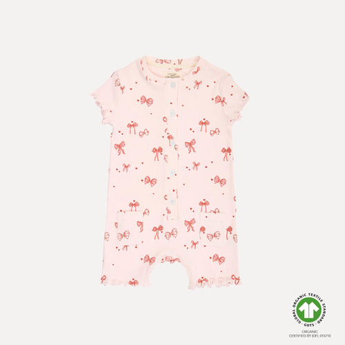 Der Belle-Anzug ist ein butterweicher, kurzärmeliger Rippstrampler in zartem Rosa, verziert mit kleinen Schleifen und einem eleganten Kragen, der einen süßen und klassischen Look schafft. Die feinen Streifen und die weiche Rippstruktur bieten sowohl Komfort als auch Charme.