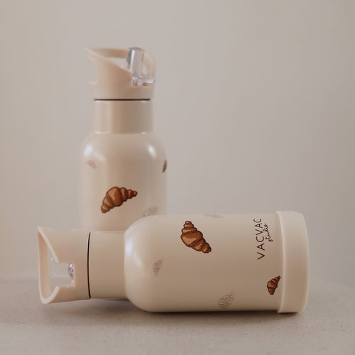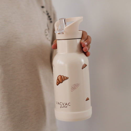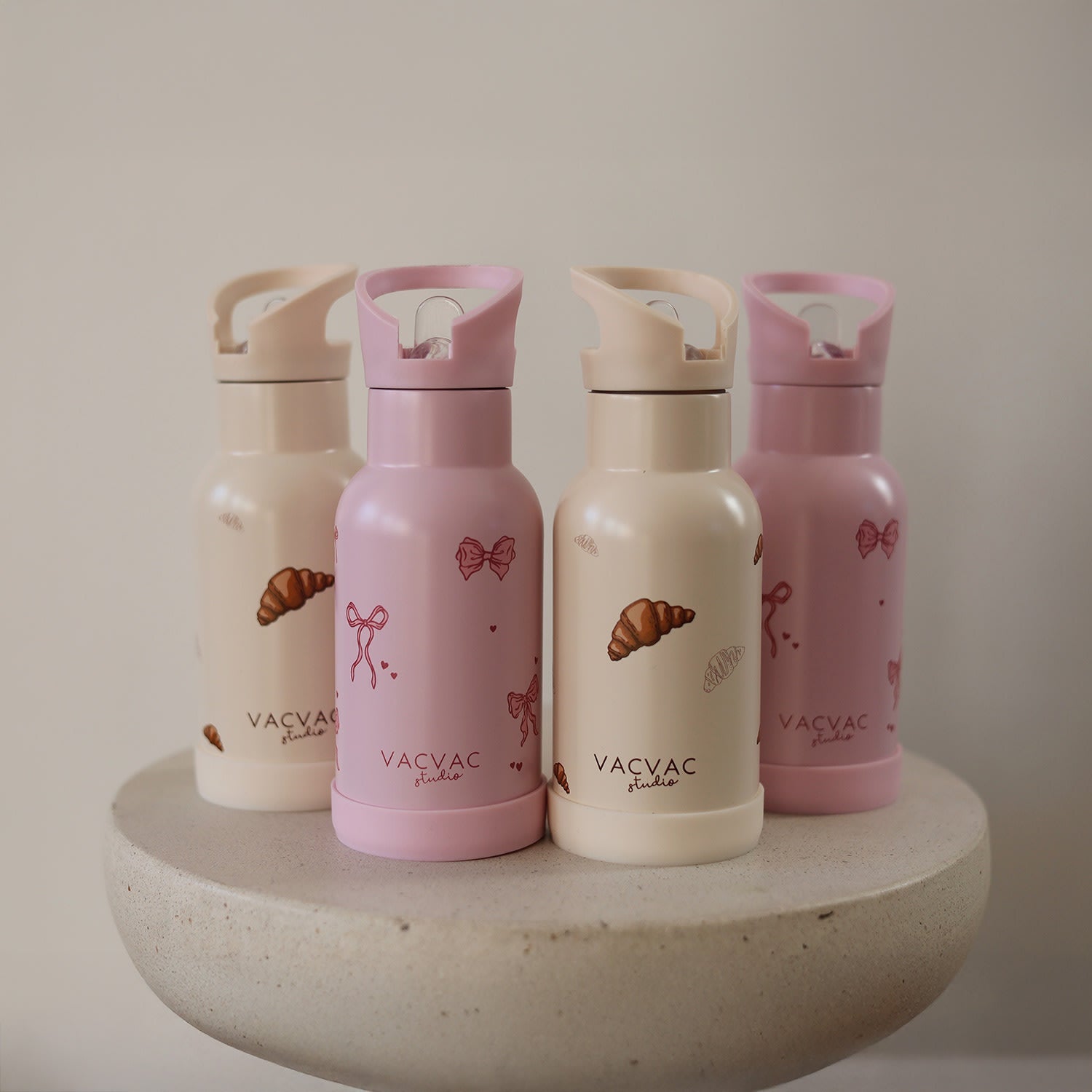 Unsere Trinkflasche im bestsellenden Croissant Mini-Design oder im neuen Belle Noeud Schleifendruck passt perfekt zur Brotdose. Sie fasst 350 ml und ist 20 cm hoch – ideal für kleine Hände und einfach mitzunehmen in der Schultasche oder auf Ausflügen.