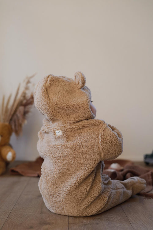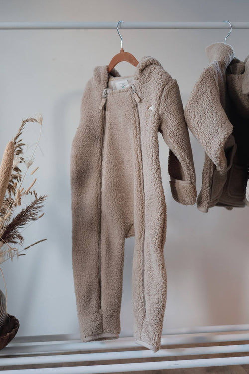 Die PELUCHE Teddyanzug ist ein Anzug aus Teddystoff mit Kapuze und Ohren. Er ist in der schönsten Iced-Coffee-Farbe. Der Anzug hat Umschläge an Händen und Füßen, um diese warm zu halten. Er wird mit 2 Reißverschlüssen geschlossen, die einen einfachen Zugang und ein bequemes An- und Ausziehen ermöglichen.