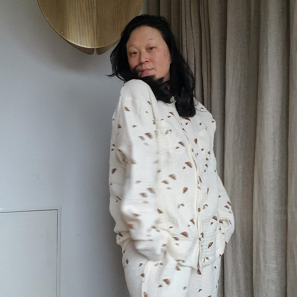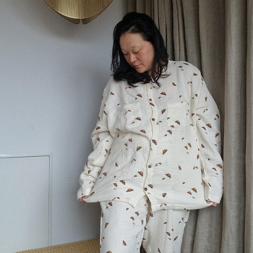 VIBBER ist ein oversized und ultraweicher Unisex-Pyjama für Erwachsene, entworfen für entspannte Morgen und ruhige Abende. Der Pyjama verfügt über zwei Brusttaschen vorne und wird mit schönen Kokosknöpfen aus natürlicher Kokosnussschale geschlossen.