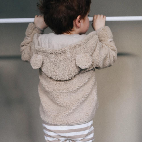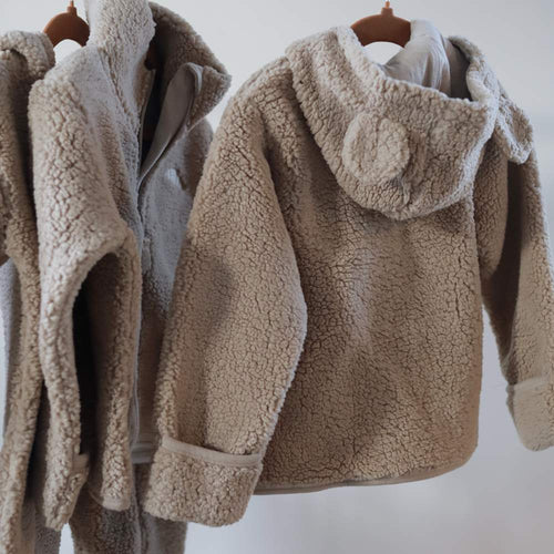 PELUCHE teddy jacket is a jacket made of teddy fabric with a hood and ears.