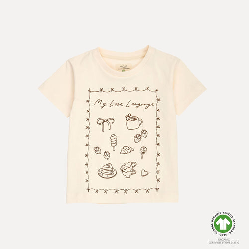 T-shirten kommer i en smuk råhvid farve og er dekoreret med citatet “my love language” samt små fine tegninger på fronten. Den passer perfekt sammen med AMÉLIE shorts og fuldender et fint, afslappet sæt.
